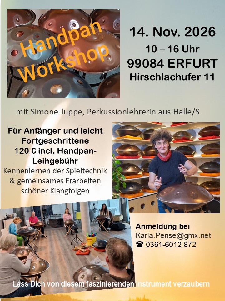 Öffentlicher Handpan-Workshop in ErfurtOrt: 99084 Erfurt, Hirschlachufer 11 |